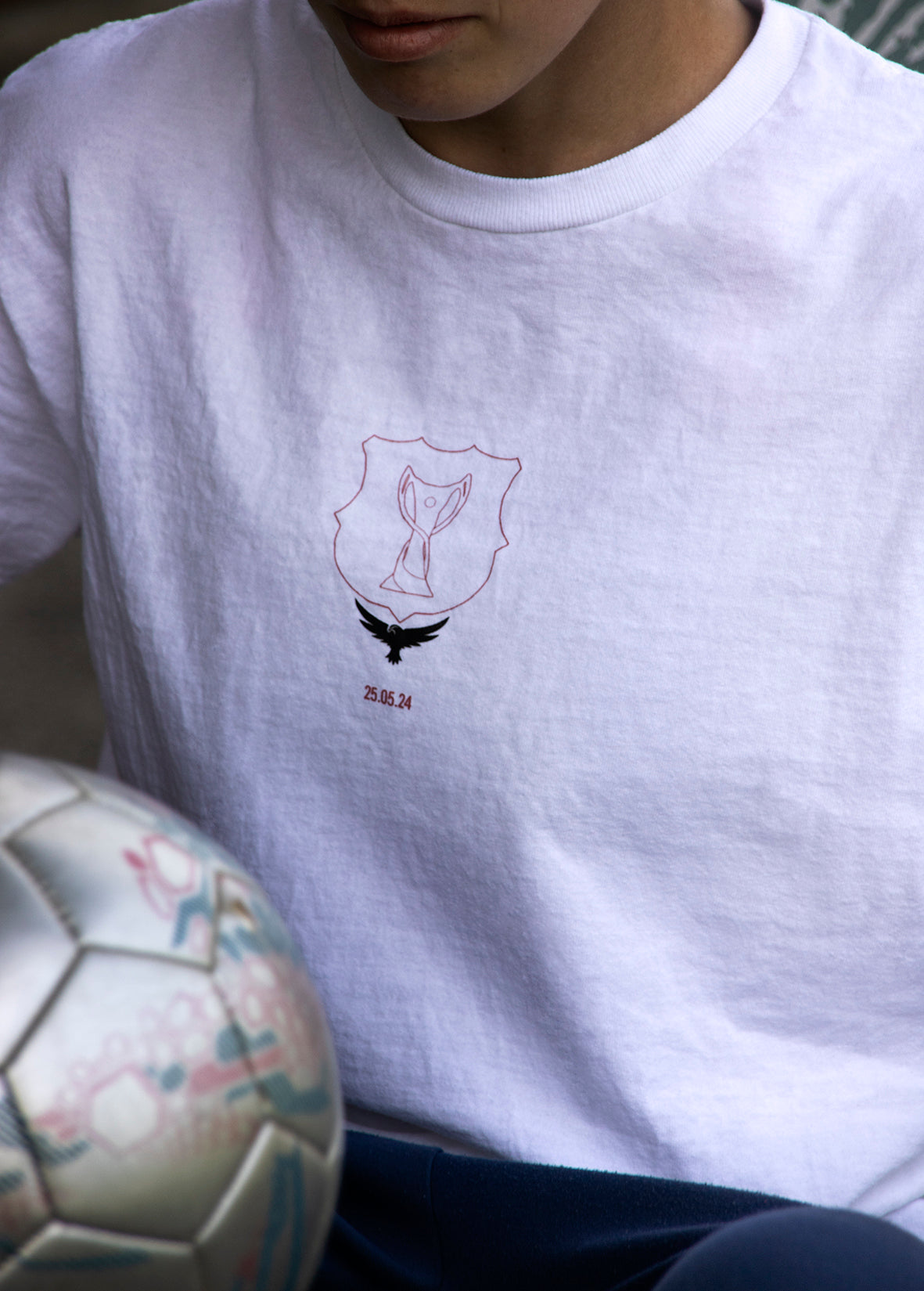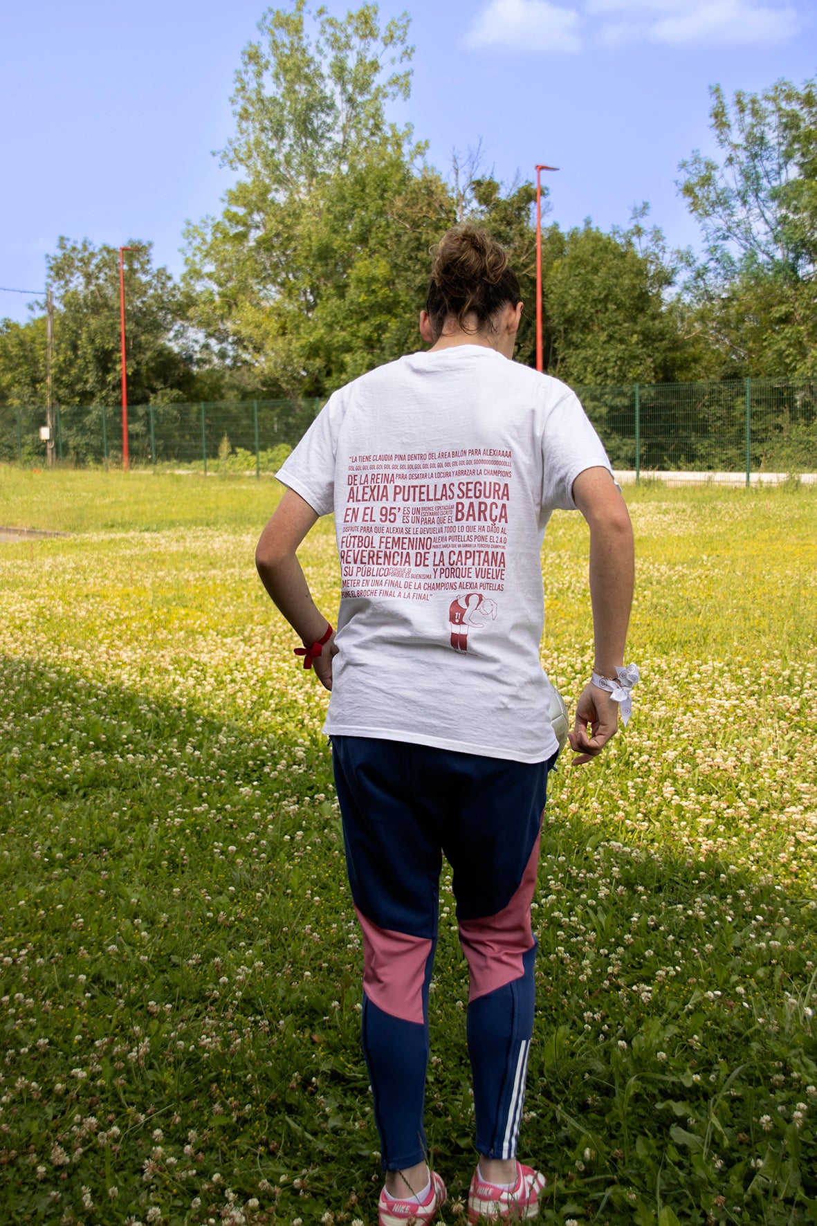 En la parte delantera, nos inspiramos en el logo del Barcelona, donde incluimos nuestro dibujo de la copa.